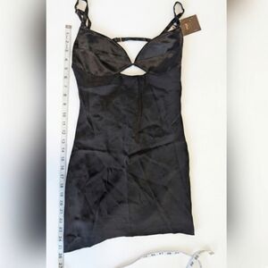 Details: Sleek black silk mini dress with adjustable spaghetti straps, structured bust, and a subtle front cutout. Perfect for nights out or special occasions.