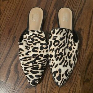 The Bleecker & Bond Simone Mule is a stylish slip-on shoe featuring a leopard print and studded accents. These mules are designed for comfort and versatility, suitable for casual outings, parties, or travel.