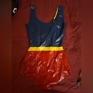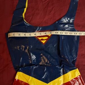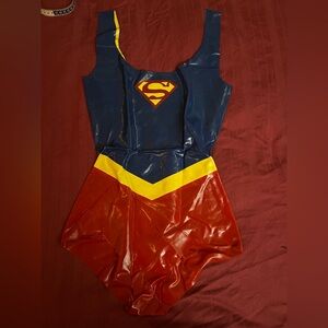 Vibrant Supergirl latex bodysuit with iconic logo. Features bold colors for a striking look.