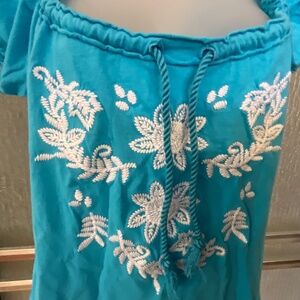 It’s is a turquoise blue embroidered off-the-shoulder peasant top with white floral stitching. This style of clothing is often associated with traditional Mexican blouses or huipiles and bohemian fashion.