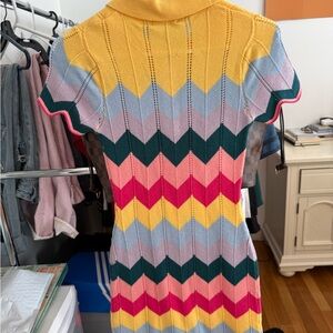 Brighten your wardrobe with this colorful chevron mini dress. Features bold patterns in yellow, pink, green, and gray. Perfect for a lively look.