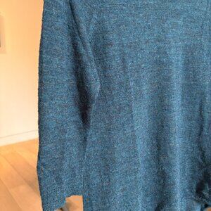 Comfortable Theory knit sweater in good condition. Made from a wool-blend knit with a relaxed silhouette. Features a classic round neckline, 3/4 sleeves, and a slightly longer back with a subtle tie detail at the hem for an easy, modern look.