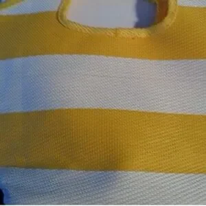 Stylish cosmetic bag with yellow and white stripes. Perfect for organizing essentials. Durable and chic design.