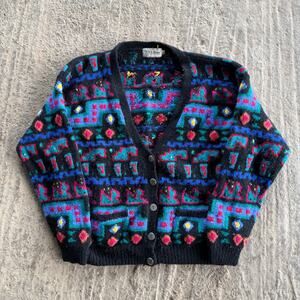 VINTAGE L.L. BEAN CARDIGAN SWEATER ARGYLE GEOMETRIC ABSTRACT KNIT LARGE 80S 90S