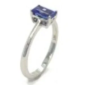 Elegant 18k white gold ring featuring a single emerald-cut tanzanite displaying a vibrant bluish-violet color.