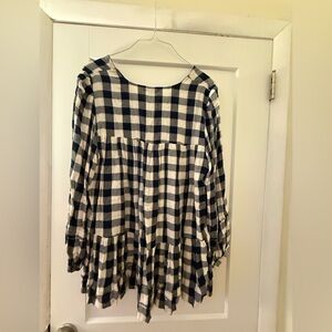Super cute and lightweight navy/cream gingham peplum top from American Eagle! Features a relaxed boho fit, tiered body, and button-front detail. Perfect for spring, summer, or layering in fall.