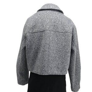 This Zara cropped jacket features a soft, textured gray finish with a clean zip-front and a slightly boxy, modern cut. The cropped length gives it an effortlessly cute silhouette that pairs perfectly with high-waisted bottoms and layered winter looks.
