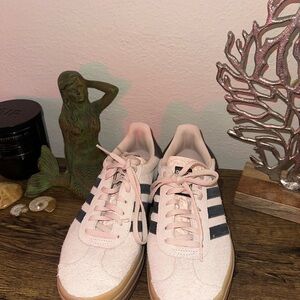 Stylish Adidas Gazelle sneakers. Beige suede with navy accents. Perfect for everyday wear.