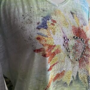 Jess & Jane 3/4 Sleeve Top Sheer Women L Made USA sublimation Artsy Print