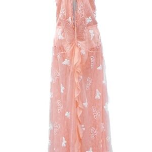 Ethereal maxi dress from For Love & Lemons with a gauzy overlay featuring floral and butterfly motifs. Slim-fitting bodice that blends into a flowy maxi skirt. Design details include a plunging neckline with ruffle trim and a lace-up construction at the back. Made using recycled materials and finished with three-dimensional butterfly accents throughout.