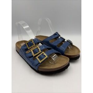 The Betula Birkenstock Sandals are a stylish and comfortable choice for women looking for a slip-on sandals with a twist. These sandals feature a blue leather upper material with animal print pattern and accents of rhinestones and a buckle detail. The flat heel and adjustable straps make them perfect for summer, fall, and spring occasions like travel, parties, or casual outings. Made in Germany by the reputable brand Betula, these sandals are a great addition to any wardrobe for a touch of outdoor bohemian style.