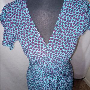 Stylish midi dress with a vibrant blue and purple pattern. Features a wrap style and short flutter sleeves. NWT!:) dress wraps around waist and has small button under bust to stay secure, has a stylish peasant/ cottagecore style.