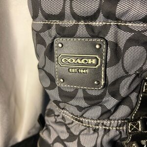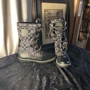 COACH signature grey and black ‘Shaine’ women's boots featuring a unique pattern. Perfect for adding a touch of elegance to your outfit. Lace up front for easy on and off, with rounded toe design. Water resistant, insulated, and comfortable!