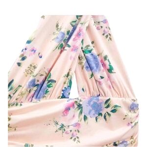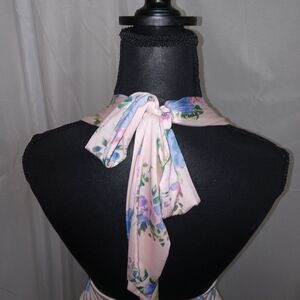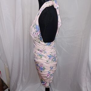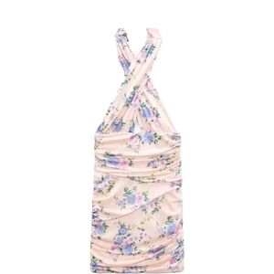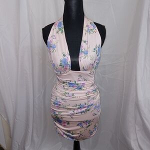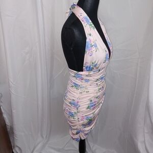 Embrace elegance with this stunning floral halter mini dress. Perfect for any occasion, this dress features a beautiful blend of pink and blue hues. Stand out with its chic design and flattering fit. ruched halter dress NWOT, can be worn as model or cross straps, very cute, measurements are shown in photos, however dress has a lot of stretch to it, fits a womens medium, ships next day!