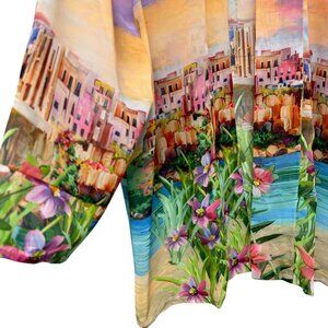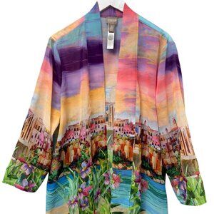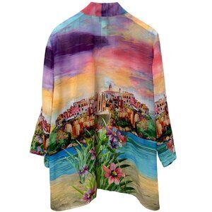 This Chico’s chiffon kimono jacket features a colorful seaside town print with a beautiful sunset and flowers. Lightweight and sheer, it’s ideal for travel, special occasions and as a statement layering piece.