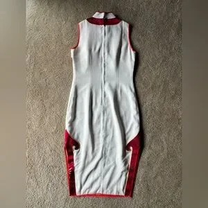 Elegant sleeveless Saisumi qipao-style dress featuring a white body with rich red brocade panels and gold detailing. Mandarin collar with traditional frog closure and tailored silhouette for a classic, refined look. Fully lined and professionally finished.