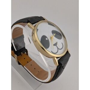 Panda Dial Watch Unisex Gold 38mm Case Faux Black Leather Band- New Battery