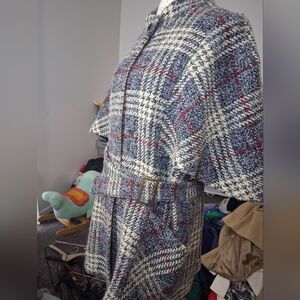 Elegant checkered cape coat. Features a stylish belt. Ideal for fashionable outings.