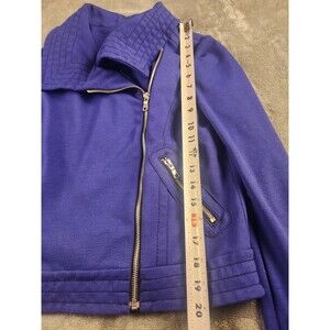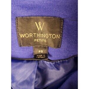 Stylish Worthington Petite jacket in a bold cobalt/royal blue color/Purple. Features an asymmetrical zip front with a modern moto-inspired look and decorative zippered pockets. Fully lined for comfort and structureperfect for work, casual wear, or layering in cooler weather.