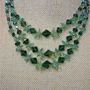 Three strands of green crystals. plays beautiful on the neck.