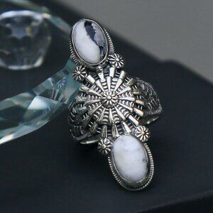 Artisan ✦ White Buffalo Statement Ring ✦ Dual Gem Sterling Silver Floral Band 9
