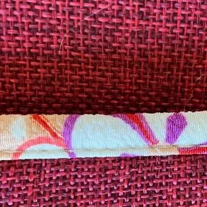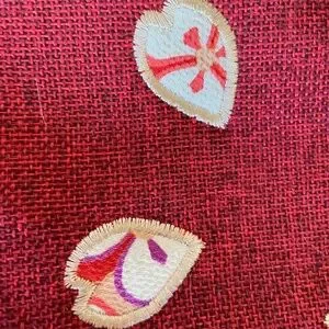 Color: Copper red canvas with gold, red, green and brown floral appliqués
