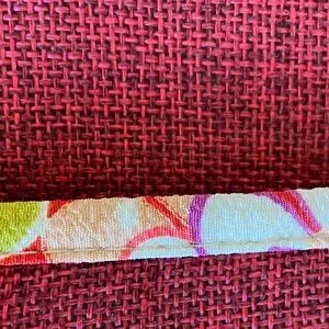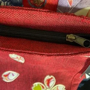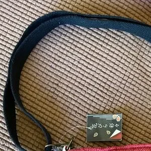 This slim, lightweight bag features colorful floral appliqués on the front and back.It has top and front zippers. plus a pocket on the back. The bag is lined with an interior pocket. The canvas strap is adjustable and removable.