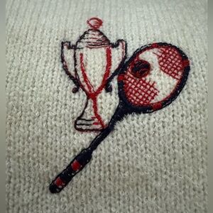50’s 60’s Tennis Preppy Sportswear Vintage Embroidered Zip Up Cardigan. Cream preppy style sweater featuring red and navy blue trim with an embroidered tennis racket and trophy motif, popular as sportswear during that era.