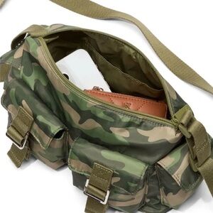This versatile bag is in the color “Green Camo” & has plenty of space for your items. Although it is a shoulder bag, it can also be worn as a crossbody. Its also in its original packaging. :)