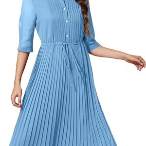 Discover elegance with this chic long sleeve blue pleated dress. Perfect for any occasion, its stylish design ensures you stand out.