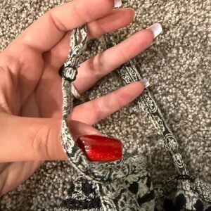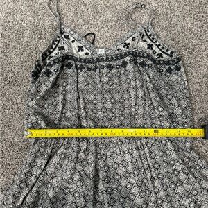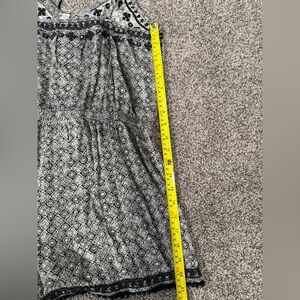 I LOVED this romper it’s just gotten too short for me. (I’m 5’9) it’s in good condition and the tassels and embroidery are still intact. It has an elastic waist and adjustable straps. It’s a black and white pattern. Size Large. Smoke free house. See pictures for length and width. The waist is elastic so it stretches. It’s only sign of wear would be it’s faded a little but that goes with the pattern as well.