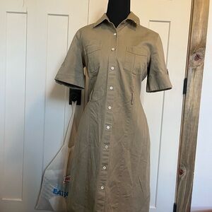 Chic khaki dress with button-up design. Features classic collar and chest pockets. Has belt loops, no belt.