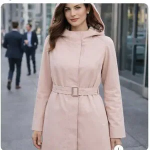 Authentic Burberry women’s hooded coat in a beautiful light blush pink. This elegant, tailored piece features Burberry’s iconic check lining, a flattering belted waist, and a clean minimalist silhouette with a concealed front closure. Crafted from 100% cotton, this coat is lightweight yet structured—perfect for transitional seasons like spring and fall. The attached hood and mid-thigh length add versatility for everyday wear, travel, or office use.