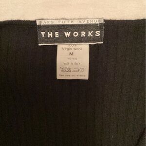 Stylish black ribbed wrap sweater with long sleeves. Perfect for a chic look. The Saks Fifth Avenue The Works Women's Virgin Wool Crossover Sweater in size medium is a stylish and versatile piece perfect for casual occasions during the winter and fall seasons. Made from high-quality wool with a knit fabric type, this ribbed sweater features a solid black color and long sleeves, making it easy to pair with a variety of outfits. The pullover style and cropped fit offer comfort and convenience, while the brand's reputation ensures a quality and timeless addition to your wardrobe. Hand washable or dry clean.