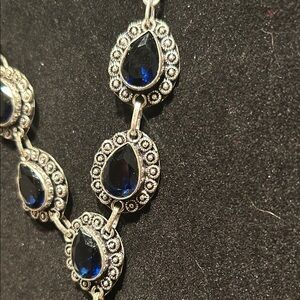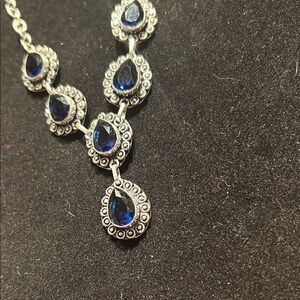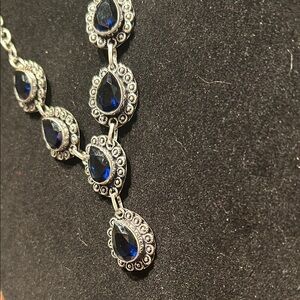 This stunning necklace features elegant blue teardrop stones set in a silver chain. Perfect for adding a touch of sophistication to any outfit.