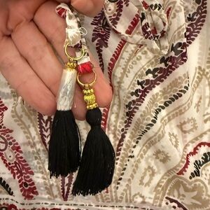 - Bohemian style kaftan or poncho top featuring a bold paisley and geometric print in rich tones of red, black, and ivory.