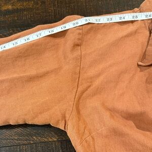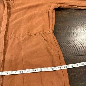 ABLE Charlyn linen blend button-up jumpsuit in a warm clay/terracotta tone. Features a utility-inspired design with a full button front, long sleeves, adjustable self-tie waist belt, and tapered ankle-length legs. Lightweight linen-blend fabric with structure and breathability—perfect for year-round wear.
