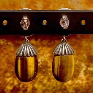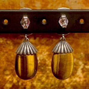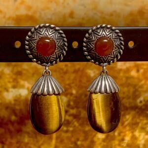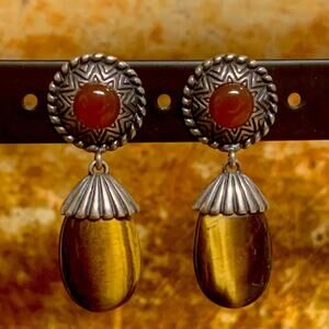 These Carolyn Pollack earrings are crafted from sterling silver, Tiger's Eye and Carnelian Agate stones. The earrings have a vintage Southwestern style and are signed by the brand. They make a unique and beautiful accessory for various occasions such as weddings, anniversaries, birthdays, and holidays. The earrings are designed with a butterfly closure and measure 1.33 inches in length, with the widest diameter of 1/2 inch. Made in the United States, these earrings showcase natural gemstones in a stunning design. Marked CP, 925 and hallmarked Relios.