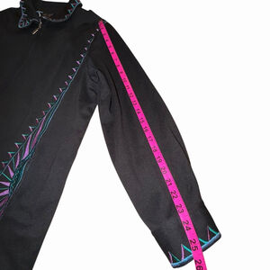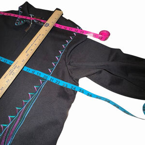 The Bob Mackie Wearable Art Jacket in size XL is a stylish and artistic piece perfect for various occasions. Featuring embroidered moon and sunrise patterns in black, purple, and blue, this short jacket with long sleeves and a full zip closure offers a unique look. Made with a nylon lining, this vintage-inspired jacket from Mackie is machine washable and suitable for winter, fall, and spring. Perfect for those who appreciate art and want a statement piece to add to their wardrobe.