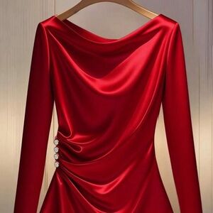 This elegant red satin dress features a sophisticated draped design with button accents. Perfect for any special occasion.