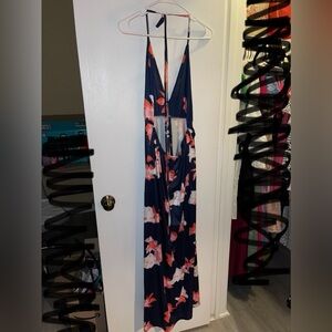 Tropical floral maxi dress in navy with pink and white flowers. Perfect for any occasion.