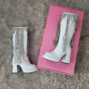 Block heel platform pull-on boots with silver chain and rhinestone fringe