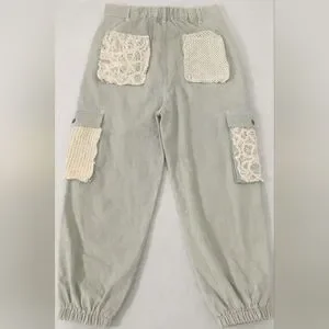 POL Crochet Overlayed Pockets Cargo Jogger Pants featuring unique crochet lace pocket detailing for a boho-utility look. Made from 100% cotton for breathable comfort with an easy, relaxed fit. Elastic waist and jogger cuffs create a flattering silhouette — perfect for casual wear, festivals, or styled street looks.