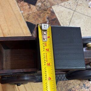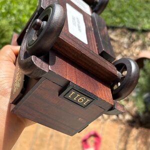 Charming wooden model truck with intricate details. Features a dark brown finish and gold accents. Perfect for collectors or as a decorative piece.