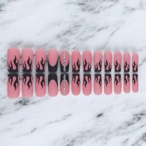 Elevate your style with this stunning black and pink nail art design. Perfect for any occasion, these nails feature a bold black flame pattern over a soft pink base, accented with elegant rhinestones. Ideal for those who love to make a statement.