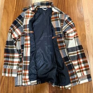 Chic plaid jacket with a zip-up front. Features a blend of black, white, and brown tones.