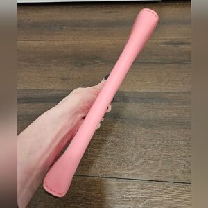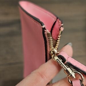 Fresh pink color, zipper closure, wristlet strap, 8 credit card slots in the interior.