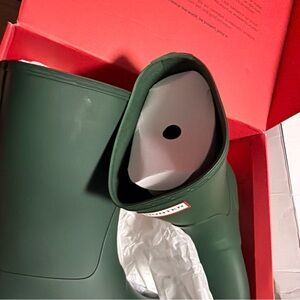 Durable dark green boots by Hunter. Ideal for rainy days.