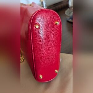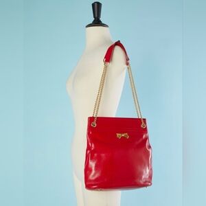 This Nina Ricci red calf leather bag has the NR signature gold bow on the front. It is leather lined with a single zippered side pocket. The double handle is a combined leather and gold chain. It closes at the top with a snap. The bag measures 11″ x 11 1/2″ with a handle drop of 11″. The gold bow on the front is 2″ wide. It has four gold feet at the bottom. It is in very good condition. The label reads Nina Ricci Paris France.