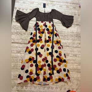 Save the Queen. Features dramatic bell sleeves, a mixed-print bodice, and an abstract polka dot midi skirt. Sheer outer layer with a fully lined skirt for coverage and ties in the back for an adjustable, flattering fit. Stretch smocked bodice and flowy silhouette. Artistic, boutique-quality piece that feels like wearable art.